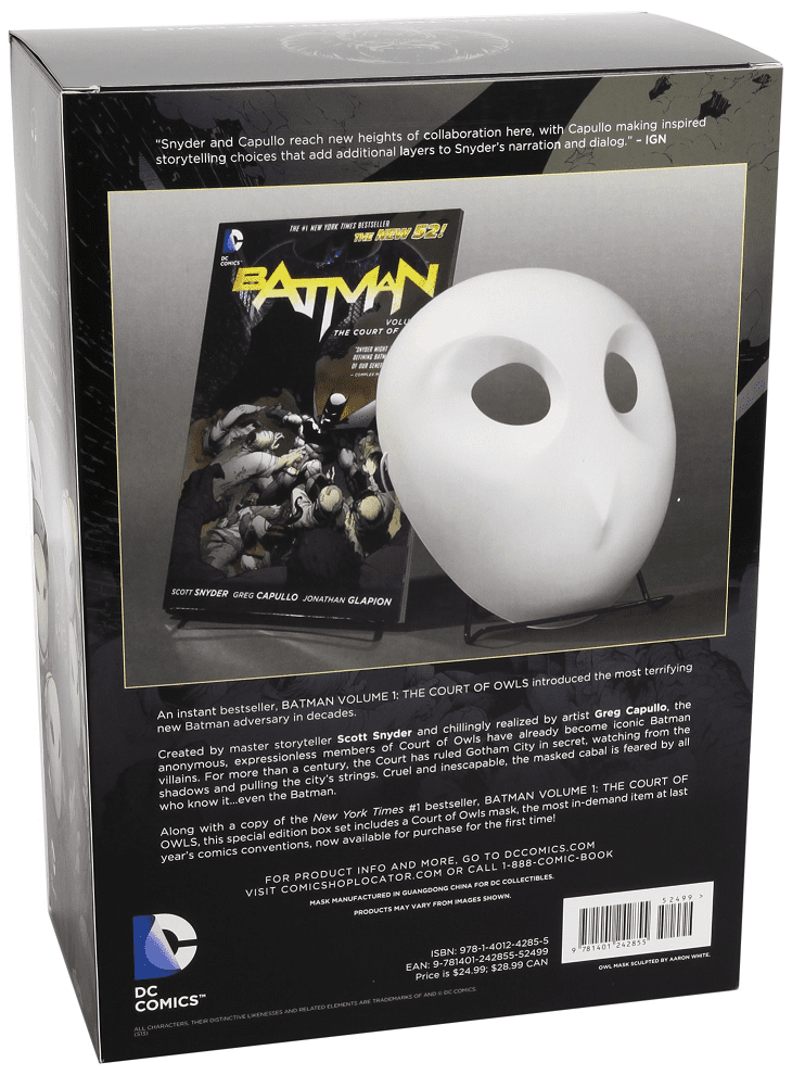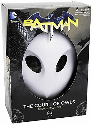 DC Comics Batman Court of Owls Book and Mask Set comes with a trade paperback copy of The Court of Owls, collecting Batman #1-7, this set includes the PVC Owl mask with white elastic band.