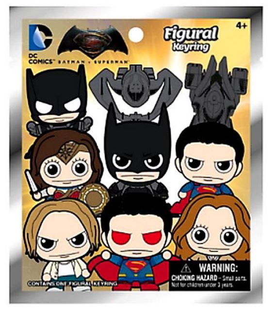 Monogram Batman vs. Superman Mystery 3D Figural Keychain Pack contains 1 random keychain. Included in this series are Superman, Batman, Wonder Woman, Batmobile, Batwing, Lois Lane, Clark Kent, Bruce Wayne, Armored Batman, Lex Luthor, and Heat Vision Superman.