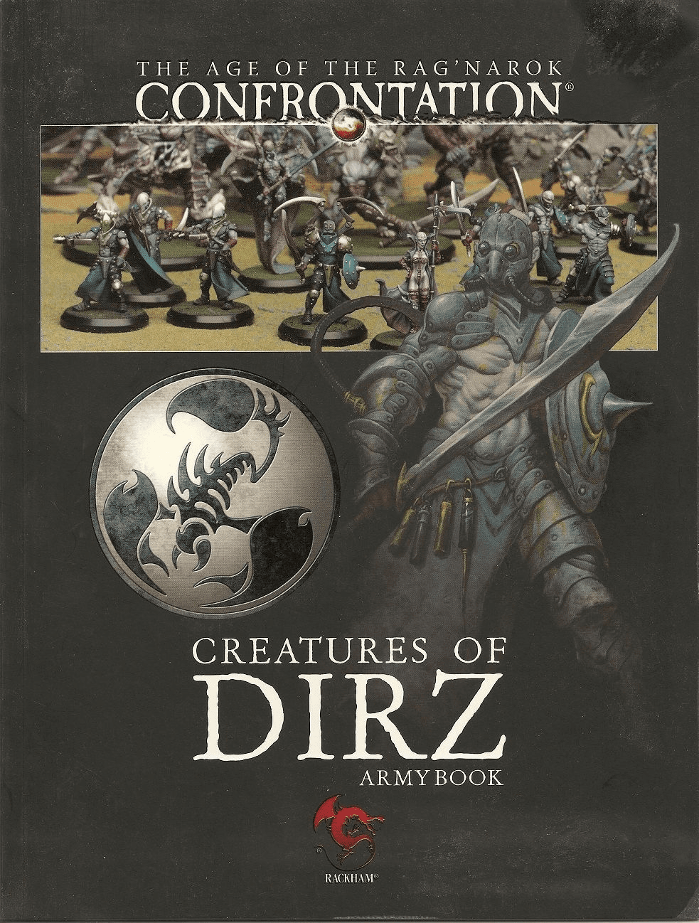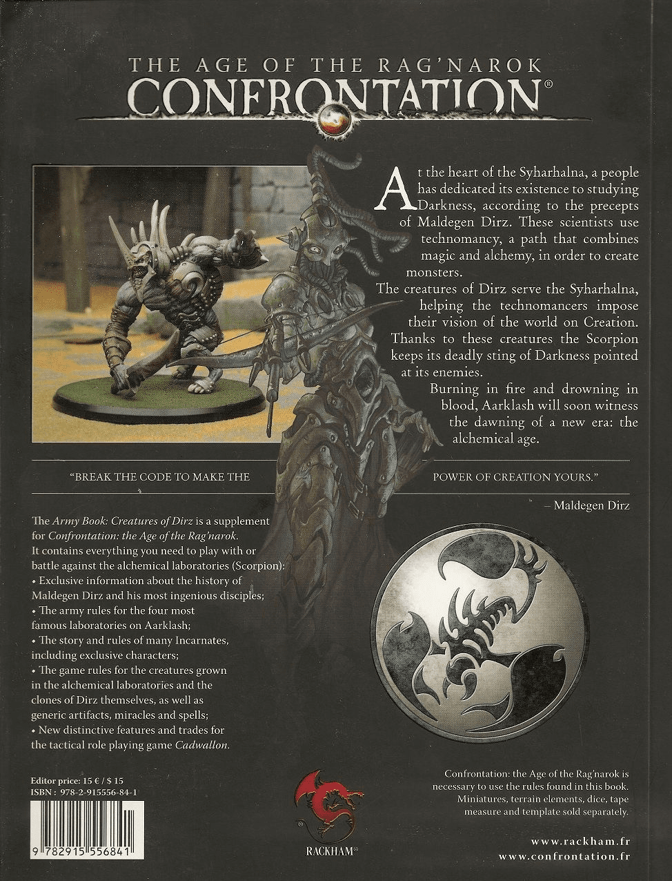 Confrontation Creatures of Dirz Army Book is a supplement for Confrontation: The Age of the Rag'narok. It contains everything you need to play with or battle against the alchemical laboratories (Scorpion): Exclusive information about the history of Maldegen Dirz and his most ingenious disciples; The army rules for the four most famous laboratories on Aarklashl; The story and rules of many Incarnates, including exclusive characters; The game rules for the creatures grown in the alchemical laboratories and the clones of Dirz themselves, as well as generic artifacts, miracles and spells; and New distinctive features and trades for the tactical role playing game Cadwallon.