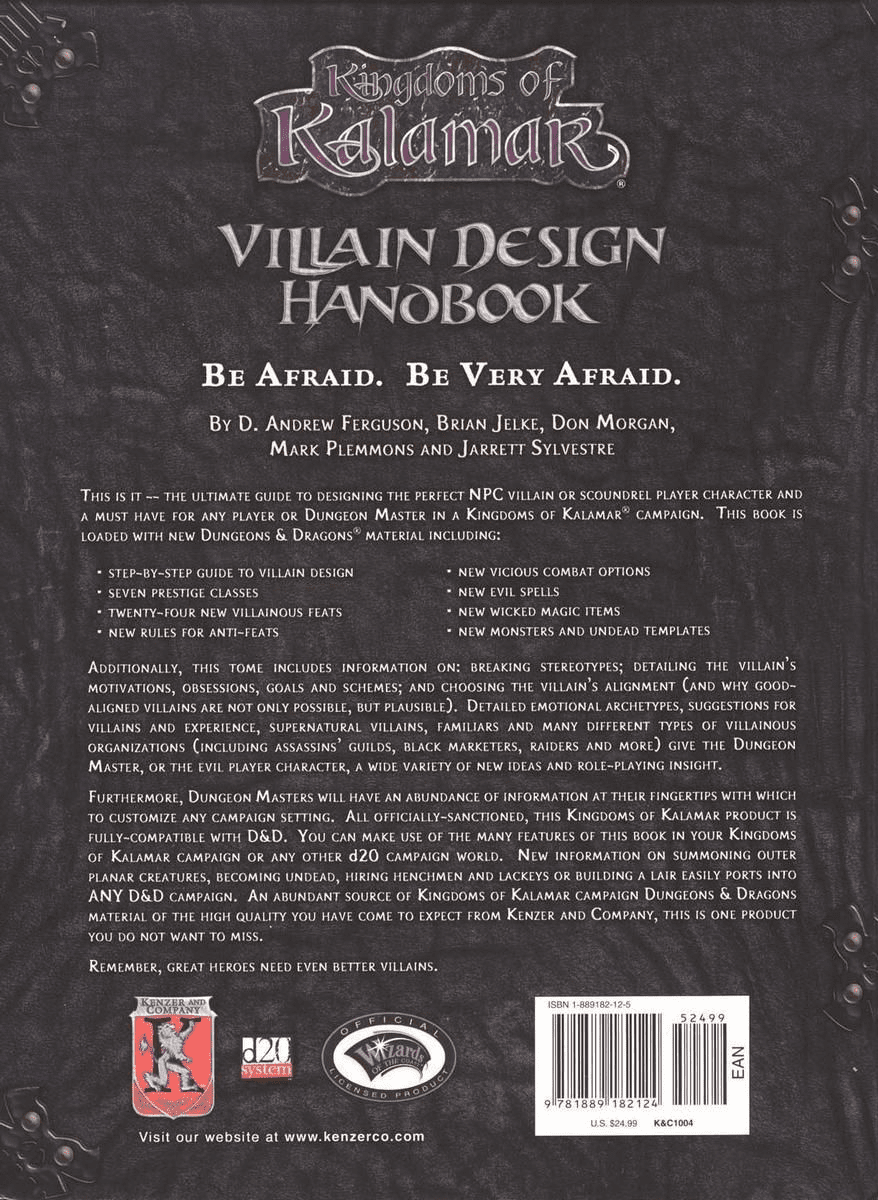 This book is loaded with new rules material including: A step-by-step guide to villain design ; 7 new prestige classes ; 24 new villainous feats ; revised rules for anti-feats ; 81 new evil spells ; vicious new combat options ; new monsters and undead templates, detailing the rituals for creating all kinds of intelligent undead.