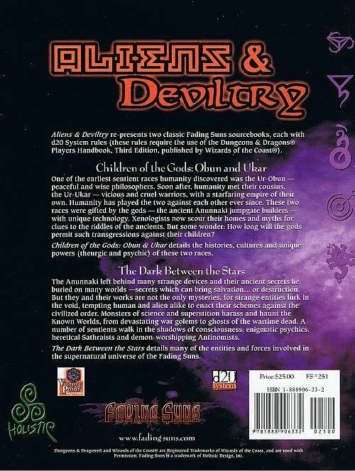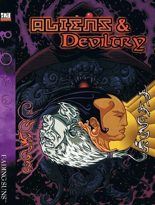 Fading Suns Aliens & Deviltry Sourcebook re-presents two classic Fading Suns sourcebooks; Children of the Gods: Obun & Ukar and The Dark Between the Stars. Each with d20 System rules which require the use of the Dungeons & Dragons Players Handbook, Third Edition, published by Wizards of the Coast.