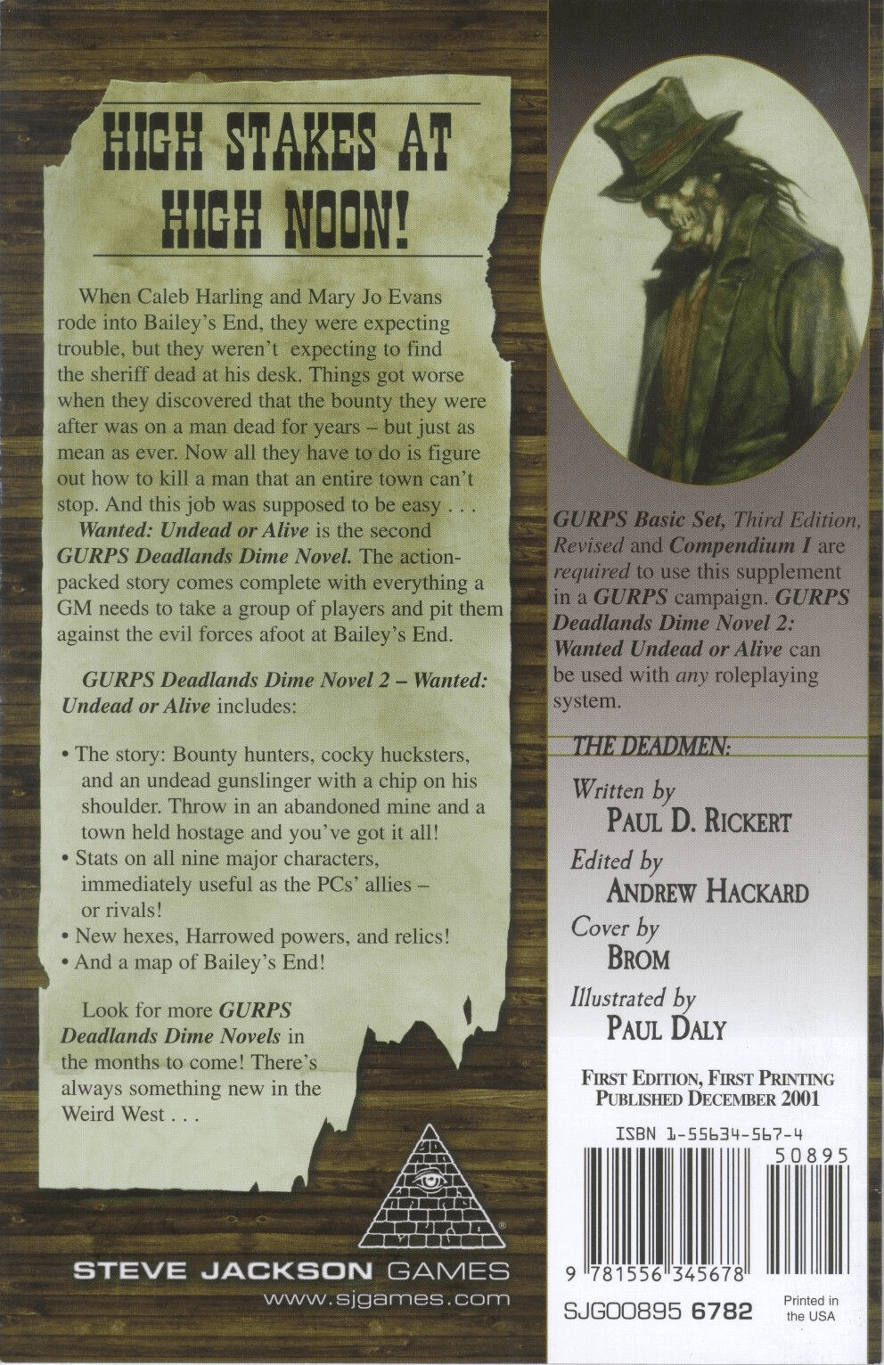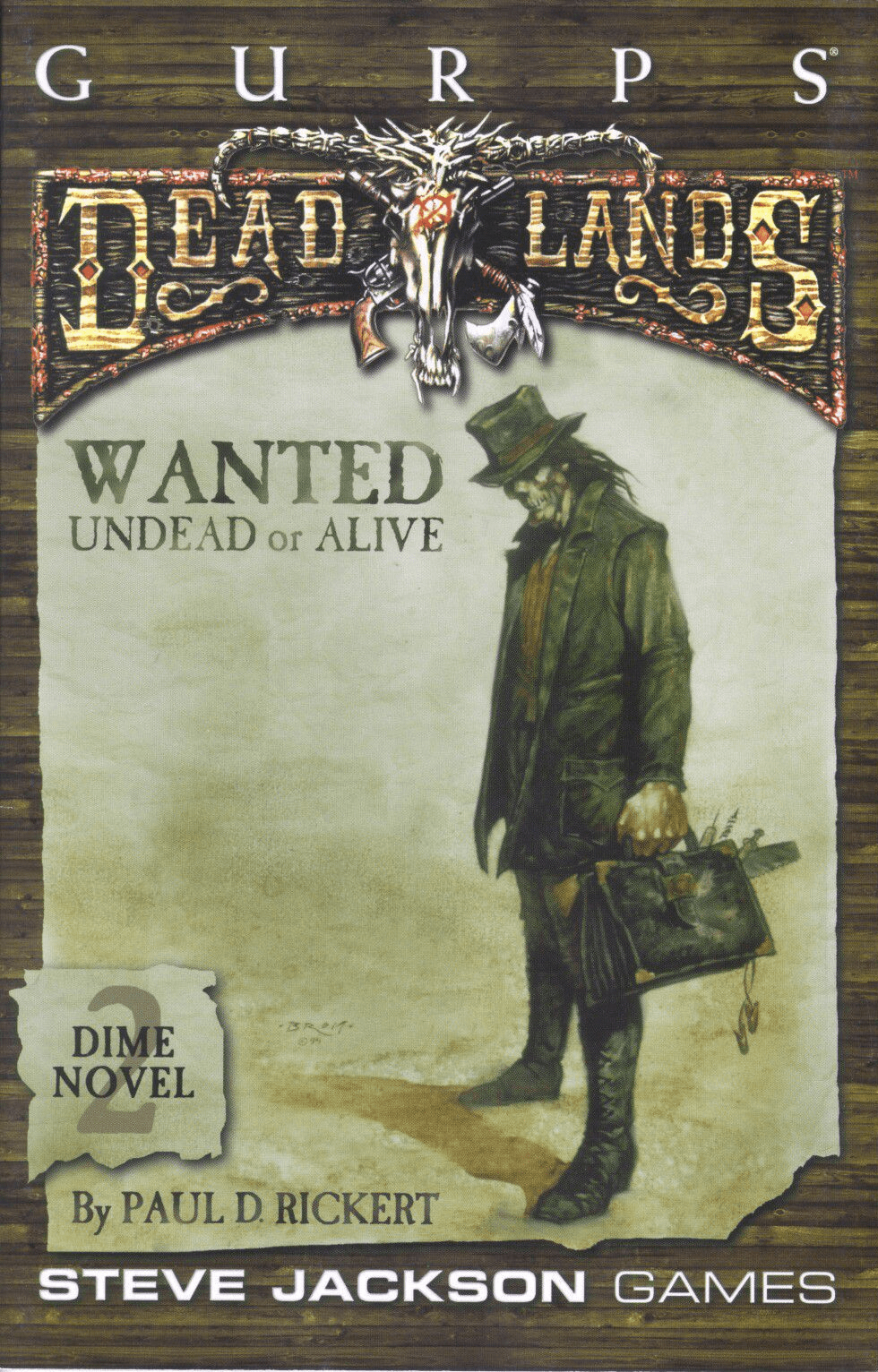 SJG GURPS Deadlands Dime Novel Wanted Undead or Alive Module includes: The story: Bounty hunters, cocky hucksters, and an undead gunslinger with a chip on his shoulder. Throw in an abandoned mine and a town held hostage and you've got it all. Stats on all nine major characters, immediately useful as the PCs' allies or rivals. New hexes, harrowed powers, and relices, and a map of Bailey's end.