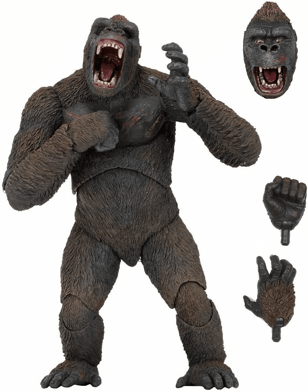 NECA King Kong Action Figure is an original take on the classic gorilla, with super detailed hair and battle wounds across the body and head sculpts. This massive figure stands at 8" tall with over 30 points of articulation. Included with the figure are 2 heads with varied expressions, a pair of open hands, and closed fist hands. Window box packaging with opening 5th panel front cover.