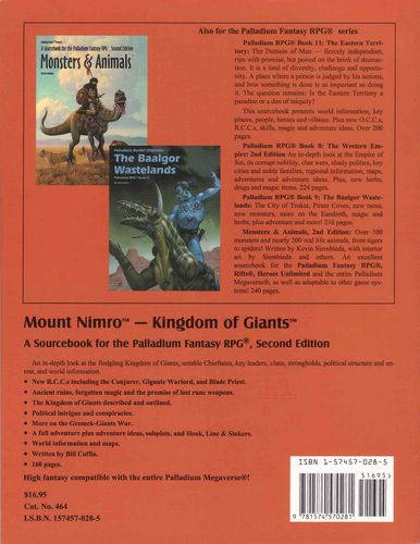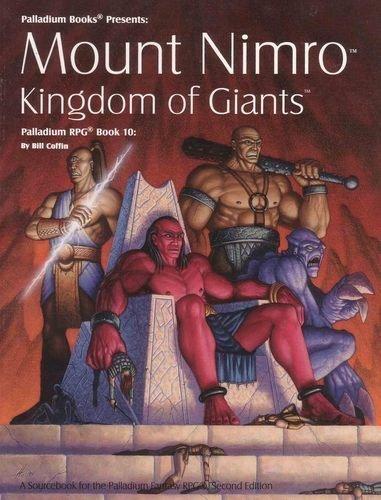 Palladium Mount Nimro Kingdom of Giants RPG Book is an in-depth look at the fledgling Kingdom of Giants, notable Chieftains, key leaders, clans, strongholds, political structure and unrest, and world information. New R.C.C.s including the Conjurer, Gigante Warlord, and Blade Priest. Ancient ruins, forgotten magic and the promise of lost rune weapons. The Kingdom of Giants described and outlined. Political intrigue and conspiracies. More on the Gromek-Giants war. A full adventure plus adventure ideas, subplots, and Hook, Line & Sinkers. World information and maps. 160 pages. High fantasy compatible with the entire Palladium Megaverse.