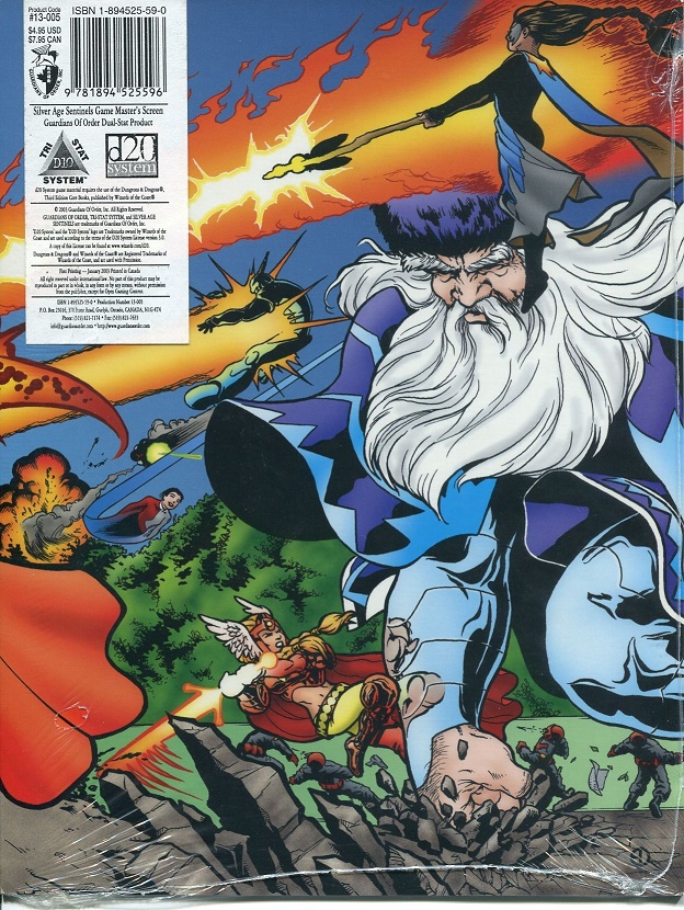 Silver Age Sentinels RPG Game Master's Screen has 3 reference panels which features tables, charts, and other resources, wrapped in a full-color, glossy panoramic image on the front. Includes handy information for both Tri-Stat and d20 Editions.