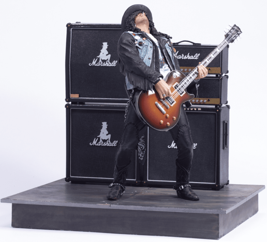 McFarlane Guns N Roses Slash boxed set includes guitar, two amps, two speaker cabinets and a larger stage-style base. Slash stands 6" tall.