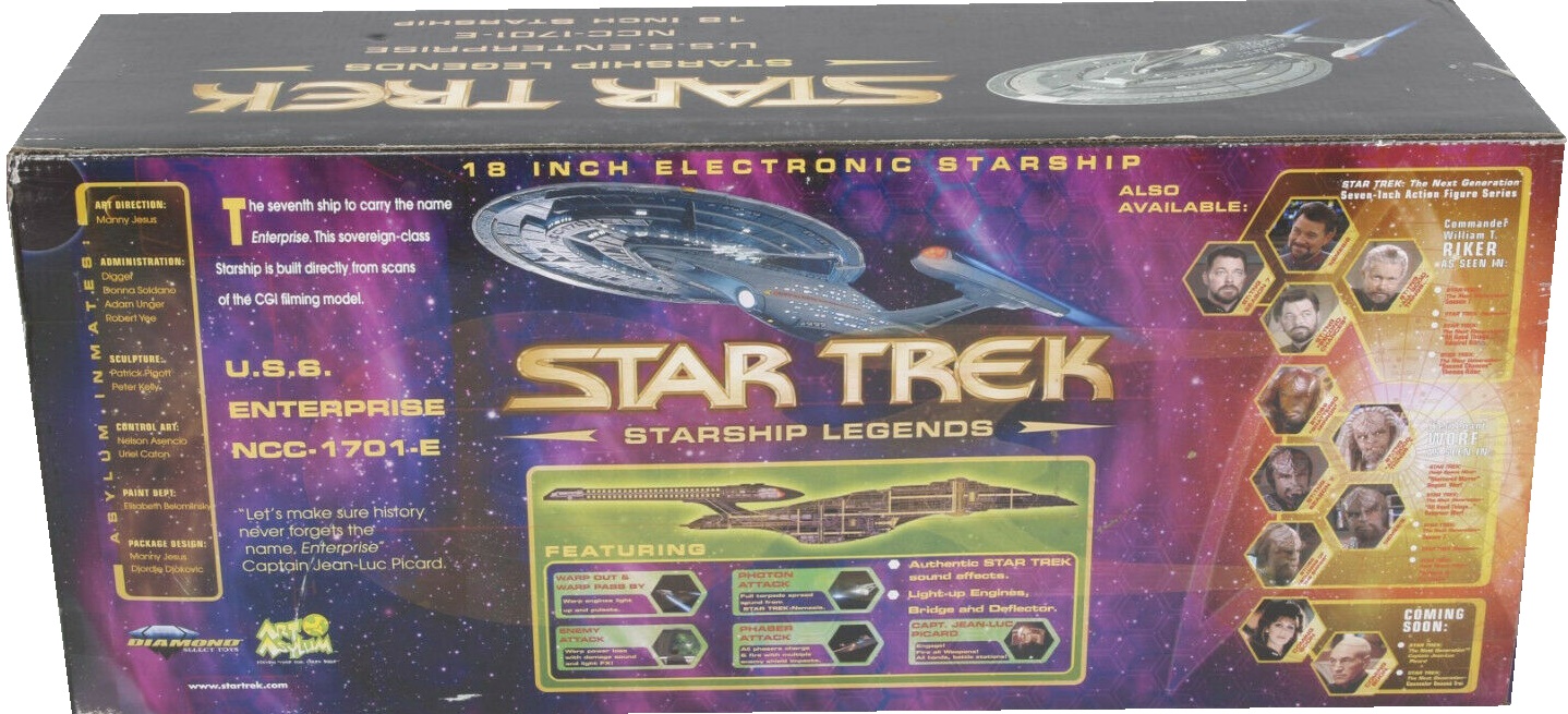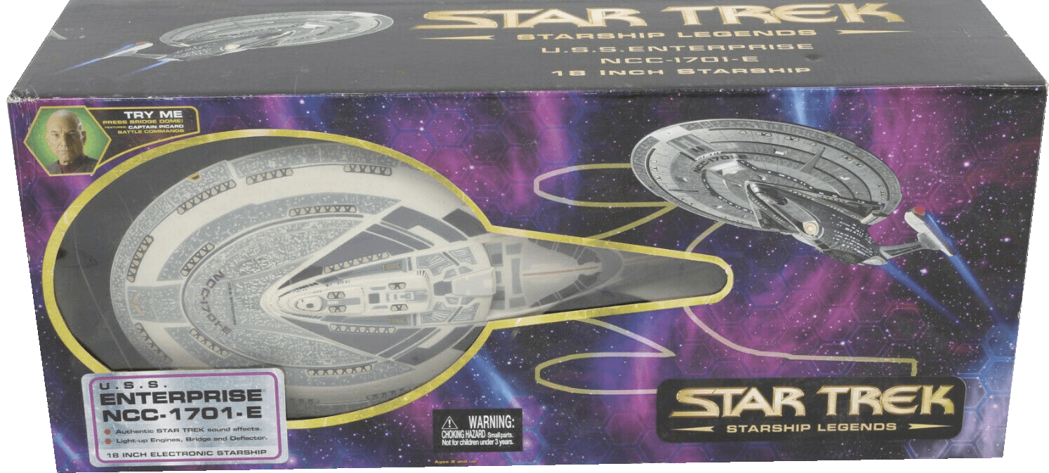 Star Trek Legends U.S.S. Enterprise NCC-1701 E Starship features realistic light and sound effects including the voice of Patrick Stewart as Captain Jean-Luc Picard! Includes a Federation stand to display the Enterprise-E in all its glory.