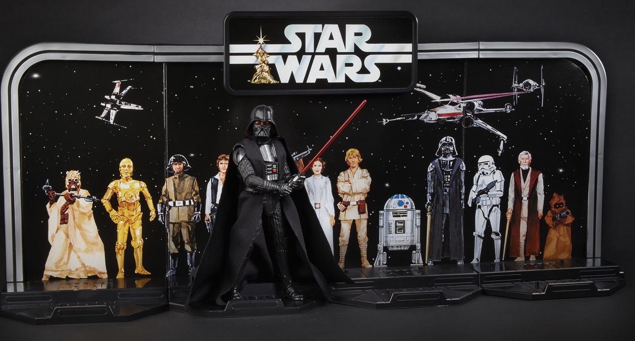 Star Wars Black Series 40th Anniversary Darth Vader Legacy Pack featuring vintage-inspired design and packaging, modeled after the Early Bird Certificate Package offered prior to the first films release in May 1977. The Legacy Pack features a vintage-inspired Darth Vader figure and a reversible backcard and display stand for all other 40th Anniversary 6-inch figures.