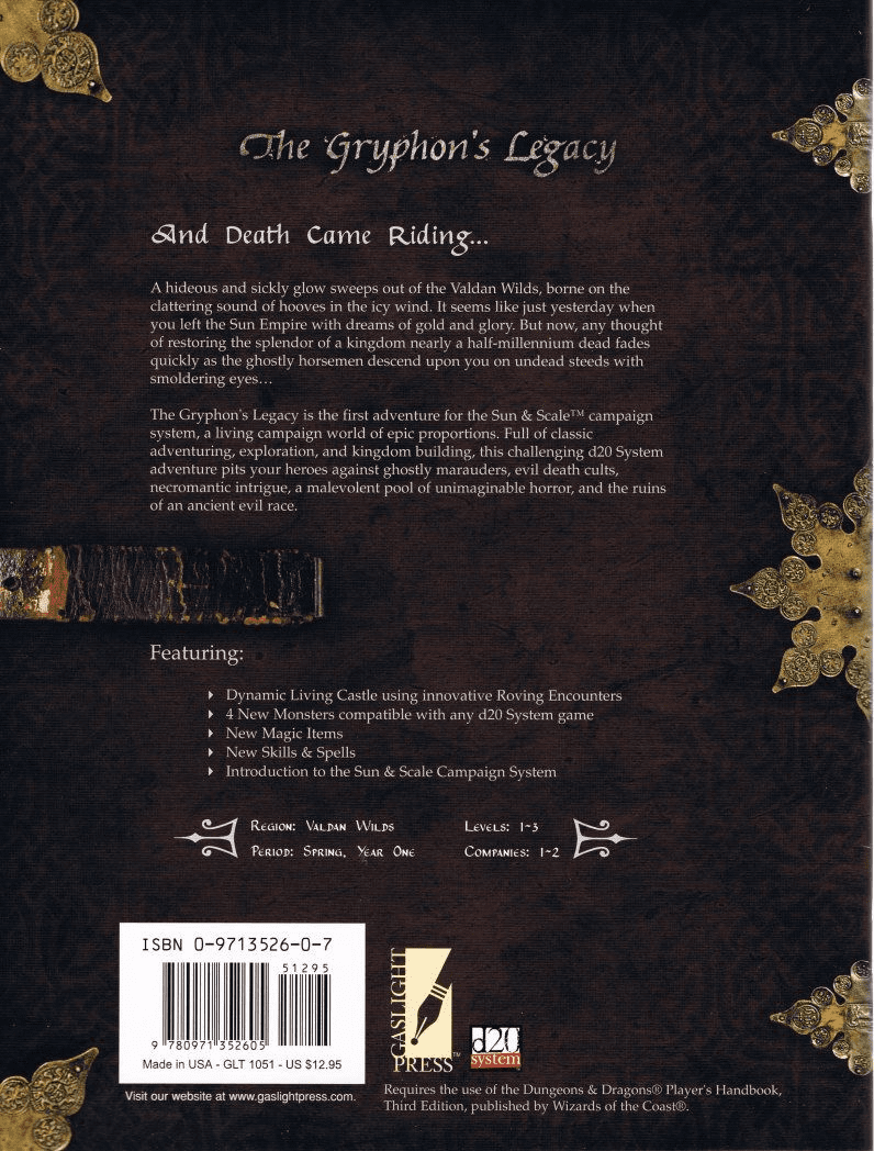 Gaslight Press Sun & Scale The Gryphon's Legacy Scenario features: Dynamic Living Castle using innovative Roving Encounters; 4 New Monsters compatible with any d20 System game; New Magic Items; New Skills & Spells; Introduction to the Sun & Scale Campaign System.