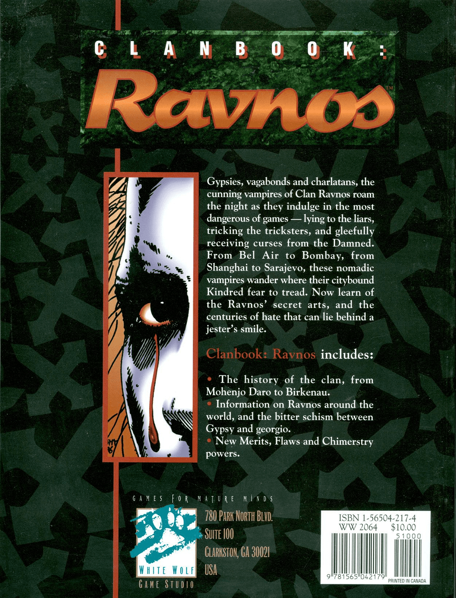 White Wolf Vampire Masquerade Clanbook Ravnos Sourcebook includes the history of the clan, from Mohenjo Daro to Birkenau; Information on Ravnos around the world, and the bitter schism between Gypsy and georgio; and New Merits, Flaws and Chimersty powers.